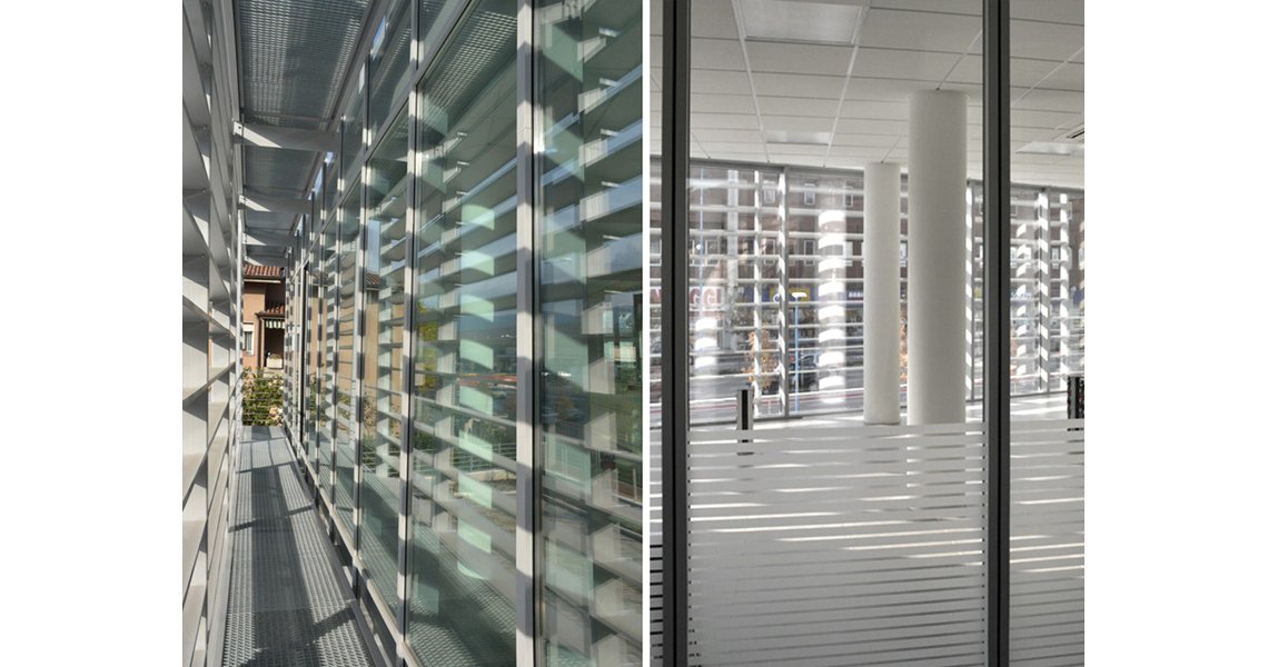 Le facciate, interamente vetrate, progettate con il sistema a doppia pelle per migliorare le prestazioni termiche e tecniche dell'involucro.